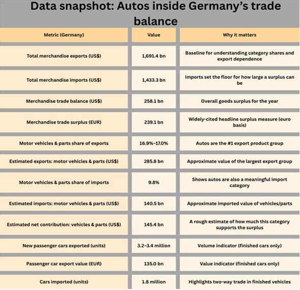 Also important: the passenger-car figures (units and € value) represent only finished new cars, while the broader “motor vehicles and parts” category includes components and systems that are essential to German industrial exports. As per Germany Import Trade Analysis by Import Globals, that broader bucket is what ties autos directly into the national trade surplus.