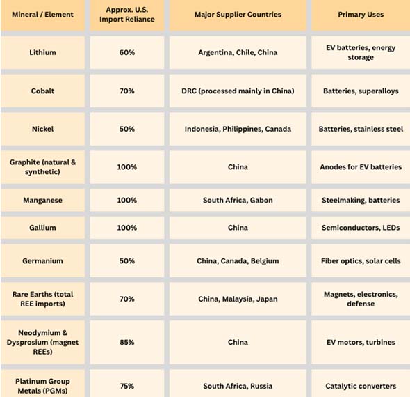The table below shows how much the U.S. needs to buy important minerals and rare earths from other countries.