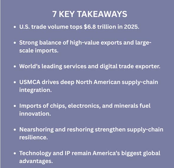 People talk a lot about exports, but imports are just as important to America's strength. The U.S. gets a lot of important minerals, medicines, clothes, machines, semiconductors, electronics, and car parts from other countries. These imports are more than just things people buy; they are important parts that the US needs to produce things, undertake research, and come up with new high-tech concepts.