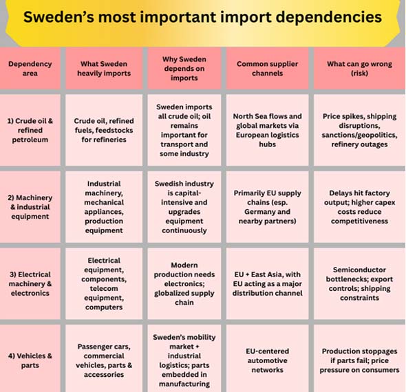 Swedish imports aren't only about what people buy; they're also significantly influenced by what businesses need (machines, electronics, automobiles, chemicals, fuels, and intermediate inputs). To properly appreciate Sweden's dependence on imports, you need to know which foreign inputs are the toughest to quickly replace without stopping production or boosting costs. One line on Sweden's dependence on imports: Energy and industrial inputs