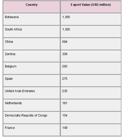 Ans. Namibia exports primarily to Botswana, South Africa, China, Zambia, Belgium, and Spain. These countries account for the majority of Namibia’s export revenue, with diamonds and fish being key traded commodities.