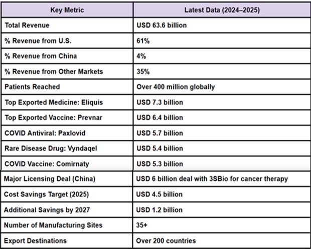 Pfizer's revenue trend appears to be stabilized as of 2025. According to its forecast, adjusted earnings per share will range from USD 2.80 to USD 3.00, while yearly revenues will continue to fall between USD 61 and USD 64 billion. The company's varied export portfolio and licensing-driven growth in Asia will continue to produce robust trade flows even as COVID-related sales normalize.