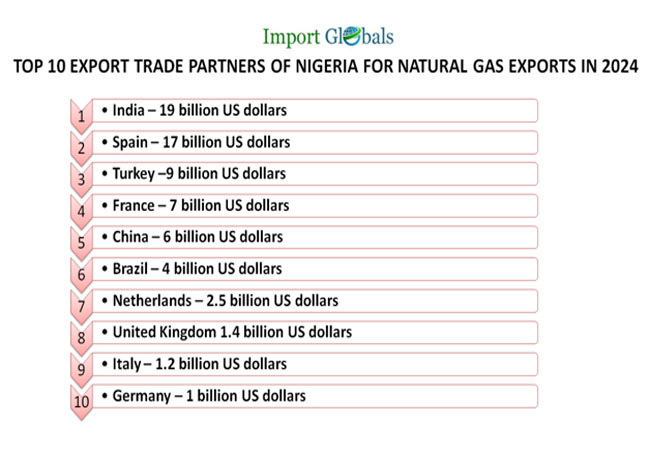 • India – According to the India Import Data, the valuation of the natural gas exported from Nigeria in 2024 – 19 billion US dollars.