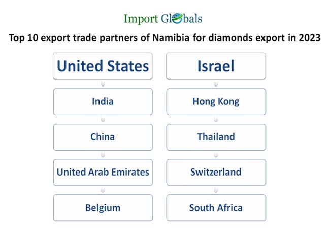 Ans. The United States is the top diamond export trade partner of Namibia in 2023.
