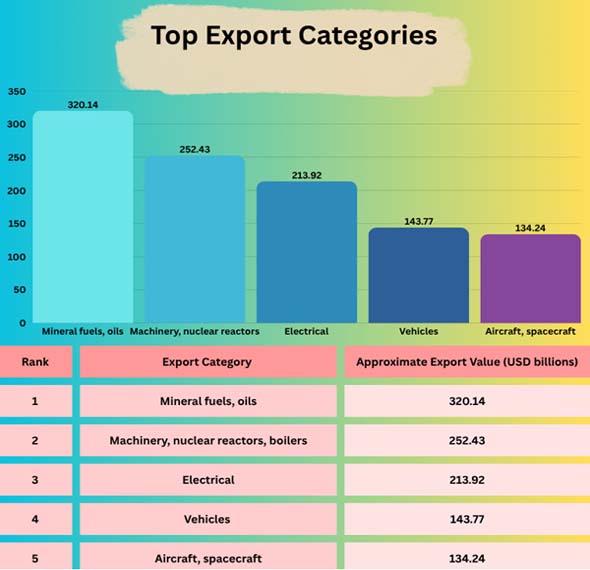 Mineral fuels and oils were the greatest export sector by monetary value in 2024, with shipments of more than USD 320.14 billion. Some of the major exports include machinery (including nuclear reactors, boilers, and other machinery), electrical and electronic equipment, autos, and aeronautical products. But mineral fuels are essential for more than simply the statistics; they are also vital for their strategic importance.