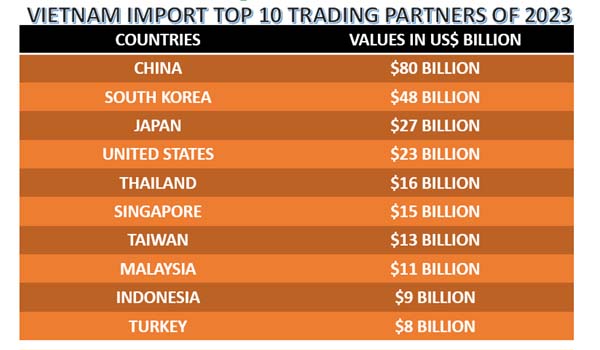 China, is the top Vietnam Import trading partner with total value of US$80 billion of goods export from China into Vietnam in the latest year.