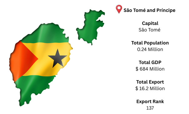 São Tomé serves as the capital of São Tomé and Príncipe, a tiny island republic in the Gulf of Guinea. The nation's GDP was around USD 684 million, while its merchandise exports brought in roughly USD 16.2 million. As per São Tomé and Príncipe export data, primary commodities, particularly cocoa, palm oil, and other agricultural goods, are vital to the economy.