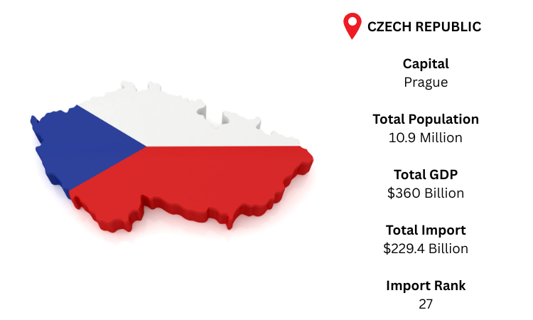 A highly industrialized nation in Central Europe, the Czech Republic is well-known for its robust machinery, automotive, and manufacturing industries. The capital, Prague, is the center of commerce and politics. As per Czech Republic import data, the Czech Republic, which has a GDP of roughly USD 360 billion and a population of over 10.9 million, is heavily involved in EU commerce.
