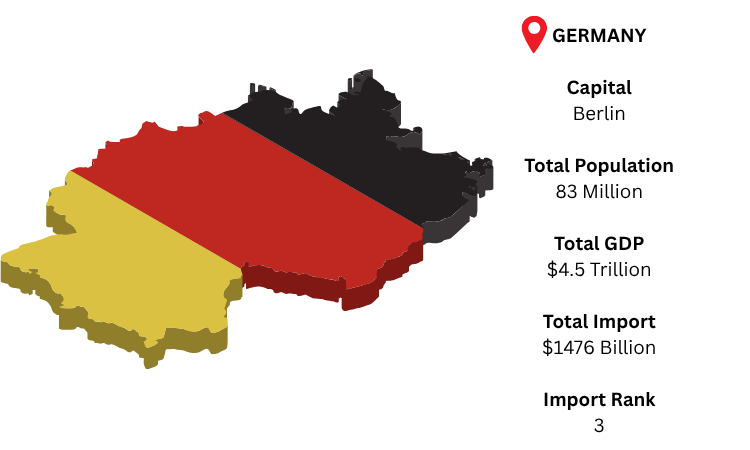 With a strong demand for energy, machinery, electronics, and automobiles, Germany is the largest economy in Europe and one of the major importers in the world. The capital, Berlin, together with industrial centers like Munich and Frankfurt, is the political and economic center. As per Germany import data, with a population of over 83 million and a GDP of over USD 4.5 trillion, Germany is a vital component of international commerce, with an expected USD 1,476 billion in imports in 2024.