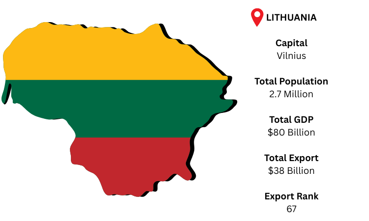 The biggest Baltic nation, Lithuania, is a vibrant exporter in Northern Europe with solid ties to both Eastern and EU markets. Chemicals, equipment, agricultural products, and refined petroleum are the main export drivers. The capital and primary export center for manufacturing and logistics is Vilnius. As per Lithuania export data, with a population of over 2.7 million and a GDP of approximately USD 80 billion, Lithuania is expected to have a strong position in regional and EU supply chains, with total exports of about USD 38 billion.