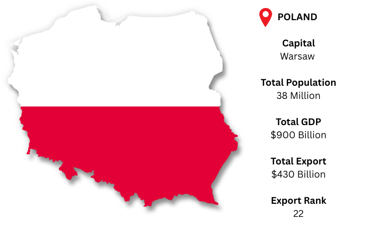 Poland is a significant exporter from Europe thanks to its competitive workforce, sophisticated industrial facilities, and robust manufacturing base. Machinery, automobiles, electronics, and industrial items account for the majority of the nation's exports, supporting its position as a vital center for the EU supply chain. The capital is Warsaw, while Gdańsk, Gdynia, and Szczecin are important ports and logistical centers. As per Poland export data, Poland, which has a population of approximately 38 million and a GDP of over USD 900 billion, is expected to export a total of USD 430 billion, demonstrating its active participation in international commerce.