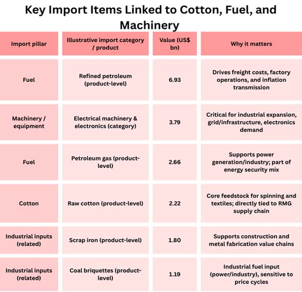 This is partly because it relies heavily on imports, which isn't talked about as much. Cotton, fuel (refined petroleum, LNG/petroleum gas, and other energy inputs), and machinery and electrical equipment will all have an impact on the country's industrial output, inflation, and foreign exchange stability between 2025 and 2026.