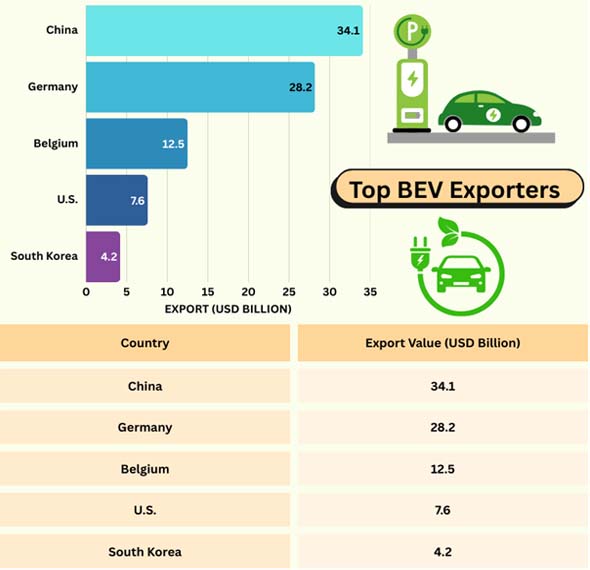 Ans. China is currently the largest exporter of battery electric vehicles, accounting for around 35% of global BEV exports in 2024.