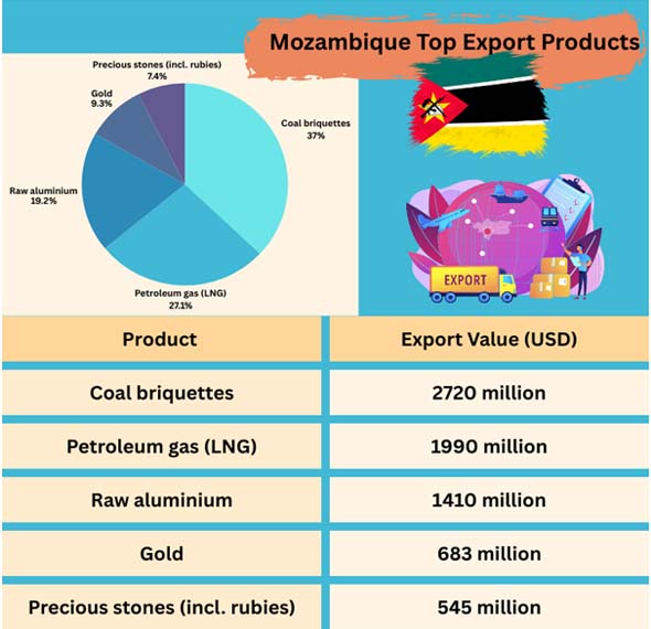 Ans. As per Mozambique Import Shipment Data, Coal, LNG, and raw aluminum top the list, with gold and precious stones also significant contributors.