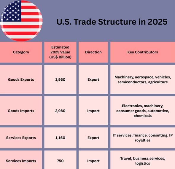By 2025, the US is estimated to do around $6.8 trillion worth of business. This will turn it into the world's most important business center. The large number comes from high demand from both consumers and businesses, as well as the fact that the country is a leader in important fields like technology, aerospace, medical, agriculture, energy, and professional services. The U.S. has a balanced trading system, which is different from many other economies that solely focus on goods or services. As per USA Exporter Data by Import Globals, goods trade is very important since people and corporations buy a lot of things from other countries. One of the best things about America in the global market is that it sells services.