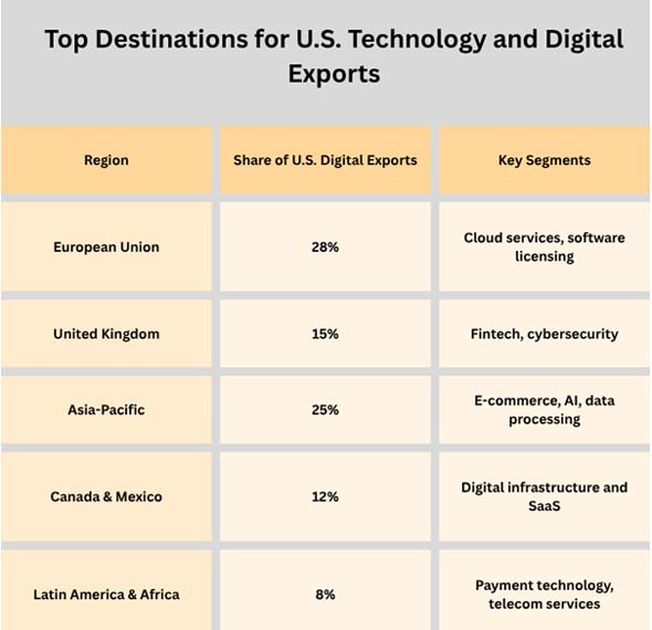Digital trade is becoming a bigger and bigger portion of the services that the USA sells to other countries. It is transforming the country's place in the world economy and giving it more power in areas like finance, e-commerce, entertainment, and cybersecurity.