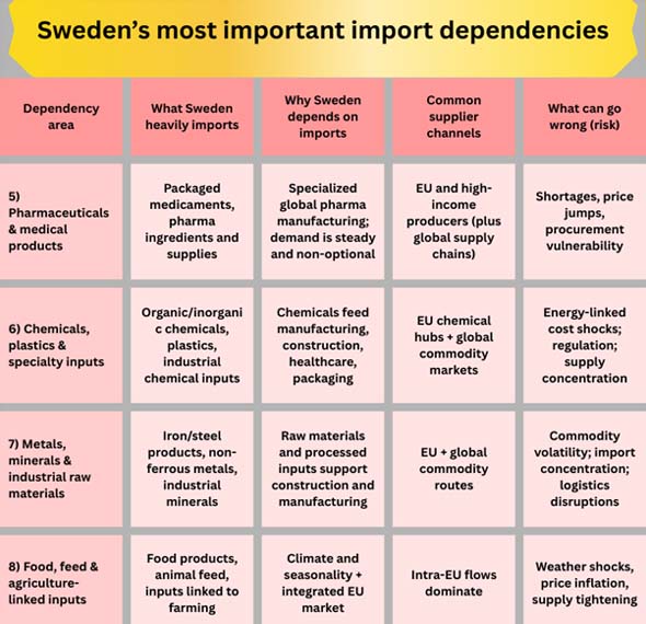 Swedish imports aren't only about what people buy; they're also significantly influenced by what businesses need (machines, electronics, automobiles, chemicals, fuels, and intermediate inputs). To properly appreciate Sweden's dependence on imports, you need to know which foreign inputs are the toughest to quickly replace without stopping production or boosting costs. One line on Sweden's dependence on imports: Energy and industrial inputs