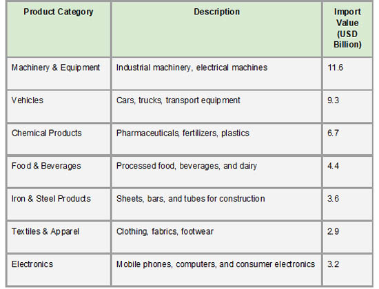 Kazakhstan's growing consumer base and continuous modernization are reflected in its main import product categories. With an estimated USD 11.6 billion in 2024, machinery and equipment, which includes mechanical appliances, electrical generators, and industrial gear, top the list. As per Kazakhstan Import Trade Statistics by Import Globals, following closely behind at USD 9.3 billion are vehicles, including trucks, passenger cars, and spare parts, which support both private consumption demands and public infrastructure. At $6.7 billion, chemical products, such as plastics, fertilizers, and medications, represent another crucial area that is necessary for the nation's healthcare and agricultural industries. At $4.4 billion, food and beverage imports show a growing desire for luxury goods and processed foods.