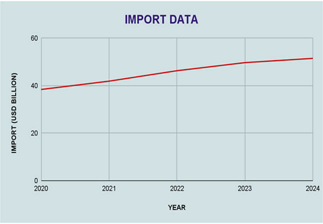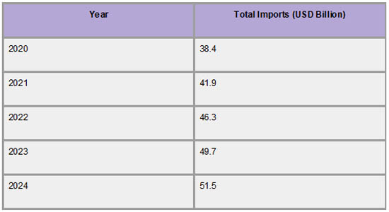 As per Kazakhstan Import Trade Analysis by Import Globals, the following years saw this increasing trend continue, with 2022 seeing a notable spike to USD 46.3 billion and 2023 reaching USD 49.7 billion. The projected amount for 2024 is USD 51.5 billion, which is a nearly 34% increase from 2020. The main causes of this consistent increase in imports include Kazakhstan's emphasis on consumer market diversity, transportation improvements, and technical innovation. The rising import bill also shows how dependent the nation is on outside vendors for essential parts needed for its growing industrial base, such as chemicals, electronics, autos, and machinery.