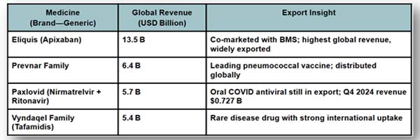 A small number of popular medications and vaccines that continue to fuel demand globally make up the majority of Pfizer's export portfolio. As per Pfizer Import Trade Statistics by Import Globals, Eliquis (blood thinner), Comirnaty (COVID-19 vaccine), Paxlovid (COVID-19 antiviral), Vyndaqel (heart disease medication), and Prevnar (pneumonia vaccine) together accounted for almost USD 30 billion of its yearly revenue in 2024.