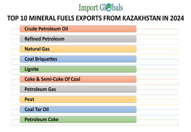 The constantly striving improvement of the trade management authorities towards the improvement of the export infrastructure has recorded a hike in export revenue. According to the Kazakhstan Export Data, the top 10 mineral fuels export trade value of Kazakhstan in 2024 are,