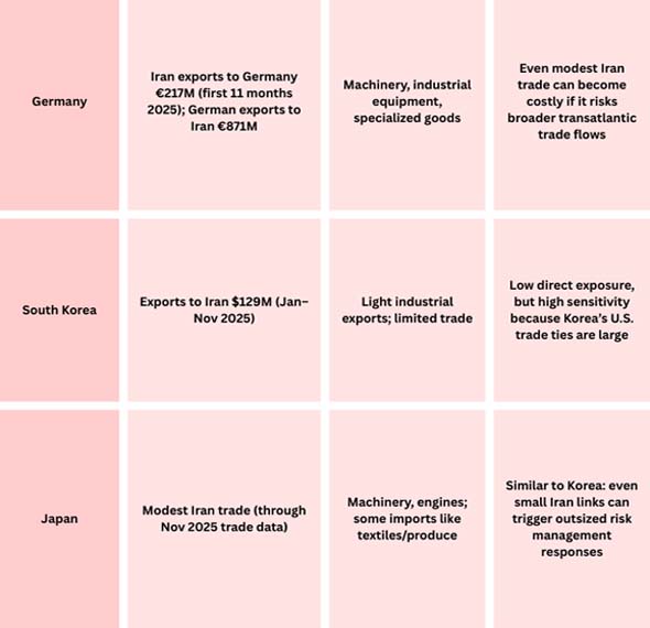 In the middle of January 2026, the U.S. put a lot more economic pressure on Iran by putting a 25% tariff on any country "doing business" with Iran.