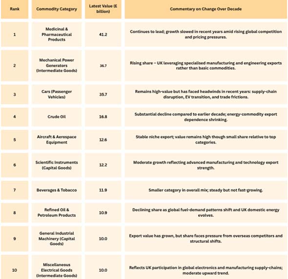 The UK goods-export market has visibly evolved in the last ten years. More and more, exports of high-value manufactured and designed goods are more essential than exports of raw materials and goods. Exports of crude oil and refined petroleum products have diminished in significance, whilst categories such as mechanical power generators, scientific instruments, and electrical goods have gained prominence.
