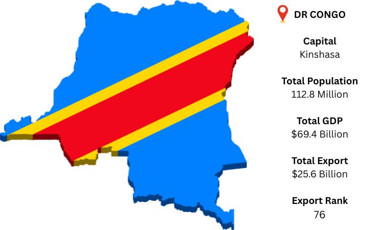 A resource-rich country in Central Africa, the Democratic Republic of the Congo (DR Congo) has borders with nine other nations, including Zambia, Angola, and the Central African Republic. Kinshasa, its capital, is the world's biggest Francophone metropolitan center. As per DR Congo export data, global financial estimations predict that DR Congo's GDP would reach USD 69.4 billion in 2024. Because of its abundant natural resources, the nation ranks 76th in the world in terms of exports, indicating an increasing importance in international commerce. The biggest importer of products from the Democratic Republic of the Congo is now China.