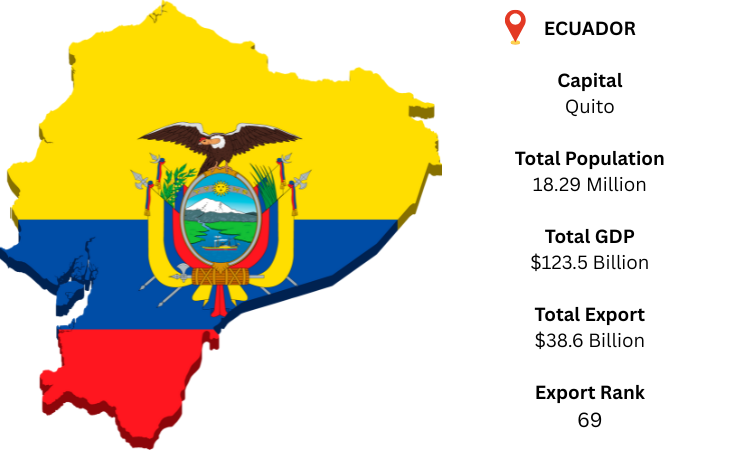 Ecuador is a diversified South American nation that shares borders with the Pacific Ocean to the west, Peru to the south and east, and Colombia to the north. It is well-known around the world for its oil-rich economy and tropical biodiversity. Quito is the nation's capital, and Guayaquil is the biggest and busiest city in terms of commerce. As per Ecuador export data, it is estimated that Ecuador's GDP will reach USD 123.5 billion in 2024. Ecuador is the world's 69th-largest exporter, according to the most recent global trade figures. With a sizeable portion of Ecuador's overall exports, the United States is the largest buyer of Ecuadorian commodities.