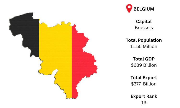 Located in the center of the EU, Belgium is a Western European nation with a sophisticated logistical network and an economy that is globally integrated. Brussels serves as both the capital and a significant European administrative center. It has a GDP of USD 689 billion and a population of about 11.55 million. As per Belgium export data, with $377 billion in exports in 2024, Belgium is the 13th-largest exporter. With strong local production and logistical capabilities through the Port of Antwerp, pharmaceuticals are the top export category, and Germany is its main export destination.