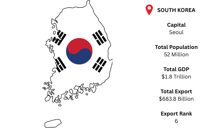 South Korea is a major player in the world market for electronics, semiconductors, automobiles, and large machinery. The capital, Seoul, is home to over 52 million people and has a GDP of about USD 1.8 trillion. As per South Korea export data, total exports hit a record high of USD 683.8 billion, with a USD 51.8 billion trade surplus.